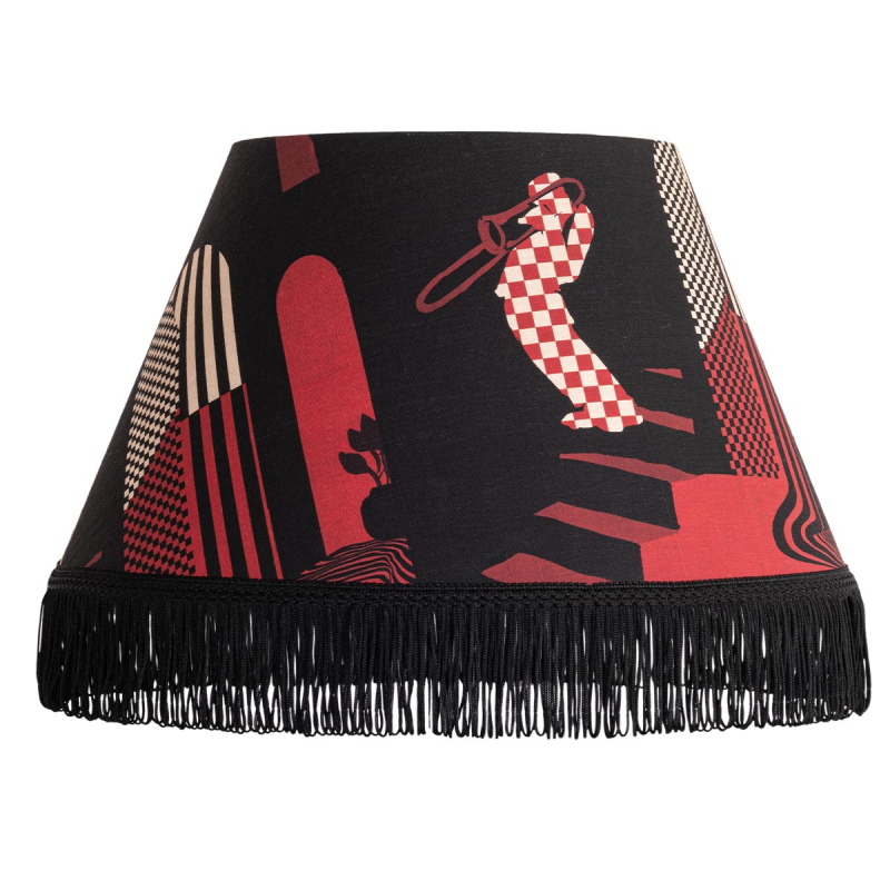 L’abat-jour Solitude esquisse un univers nocturne inspiré d’un club de jazz déserté. Un musicien en damier, joue dans le silence, entouré d’arches, d’escaliers et de formes graphiques. Le motif abstrait révèle des contrastes nets et une composition rythmée. Conçu par Mindthegap, ce décor habillé d’une frange épaisse crée une ambiance feutrée et cinématographique.