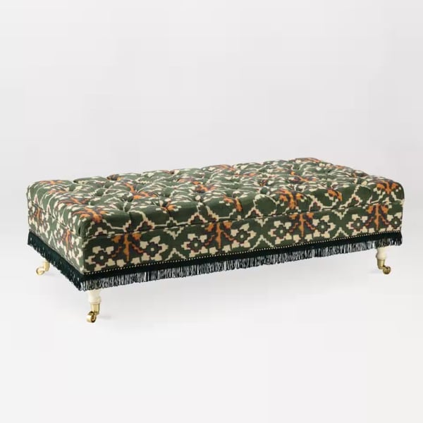 Mit seinen großzügigen Volumen und dem Leinenstoff setzt sich der Sitz Zold Linen in den Innenräumen durch. Diese Ottomane verfügt über ein stilisiertes florales Ikat-Muster, das von orientalischen Traditionen inspiriert ist. Das Design wird durch eine tiefe Polsterung und einen Fransenrand unterstrichen. Mindthegap vervollständigt das Set mit Holzfüßen, die auf goldenen Rollen montiert sind.