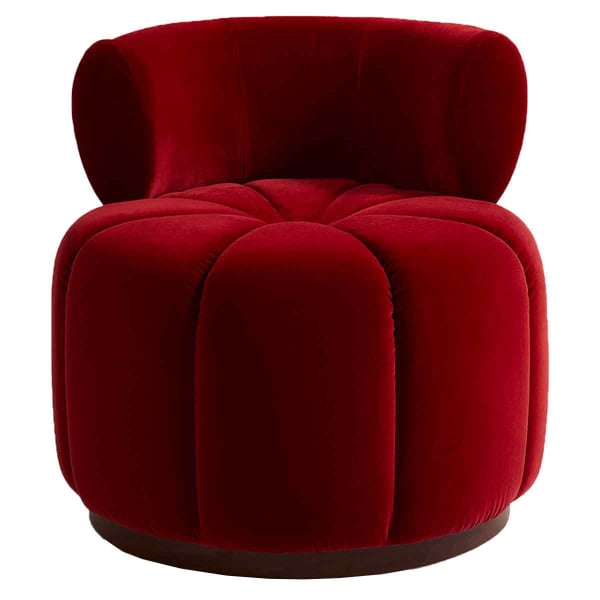Avec son allure sculpturale, le fauteuil Le Gainsbourg Velours de Clovi déploie un motif rayonnant qui évoque une floraison. Le velours de coton, naturellement soyeux, capte chaque variation de lumière et souligne le relief de ses courbes généreuses. Des coutures régulières structurent l’assise en pétales enveloppants. L’ensemble repose sur un bois massif, qui renforce la présence stable et ancrée du modèle.