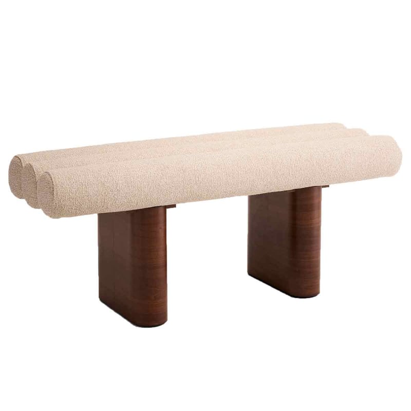 Le Pompidou Tweed est une assise sculpturale dont le motif texturé compose une surface bouclée. Des cylindres tapissés de coton et de laine naturelle dessinent une silhouette graphique, rythmée par le relief souple du tissage. La base en bois massif, dense et arrondie, contraste avec la douceur du textile. Clovi façonne un objet tactile pensé comme une construction architecturale.