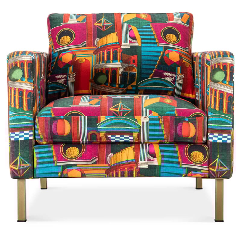 Maverick Clubchair Piazza Degli Arlecchini est un fauteuil sculptural en bois robuste, imaginé par Mindthegap. L’assise et le coussin, généreusement rembourrés, s’habillent d’un tissu en lin au motif géométrique audacieux. Colonnes, obélisques, escaliers et coquilles composent une scène architecturale dense, transfigurée par la fantaisie. Les pieds en métal ancrent la structure tandis que la richesse des figures accentue l’effet de spectacle.