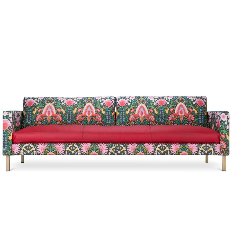 Le sofa?Maverick Susie Q est un canapé au revêtement en lin naturel imprimé d’un motif floral luxuriant. Signé Mindthegap, le dessin audacieux évoque une ambiance festive et légèrement psychédélique. Le coussin recouvert de cuir uni crée un contraste avec l’intensité de la composition végétale. Ce modèle, inspiré du style mid-century, repose sur des pieds métalliques qui affinent la silhouette.