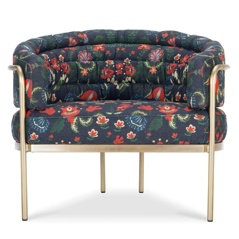 Signé signé Mindthegap, le fauteuil Peregrine Zabola Linen présente un velouté végétal d’inspiration forestière. Fleurs et feuillages du jardin sauvage carpatique composent son motif floral sur du lin imprimé. La structure métallique souligne les courbes accueillantes et confère un air délicat et raffiné. Le contraste entre le dessin dense et le style minimaliste affirme une présence singulière.