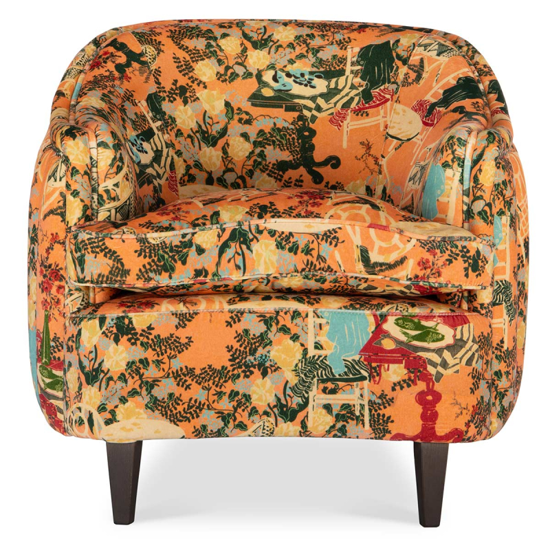 À travers son motif scénographique dense, le fauteuil Scarlett La Brasseria incarne un moment suspendu. Des feuillages, des silhouettes et des éléments d’architecture surgissent sur sa surface enveloppante en velours de coton. Les lignes généreuses, la finition en clous vieillis et ses pieds en bois soulignent une présence singulière. Signé Mindthegap, ce modèle affiche une richesse graphique.