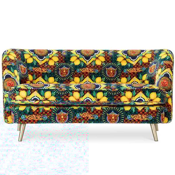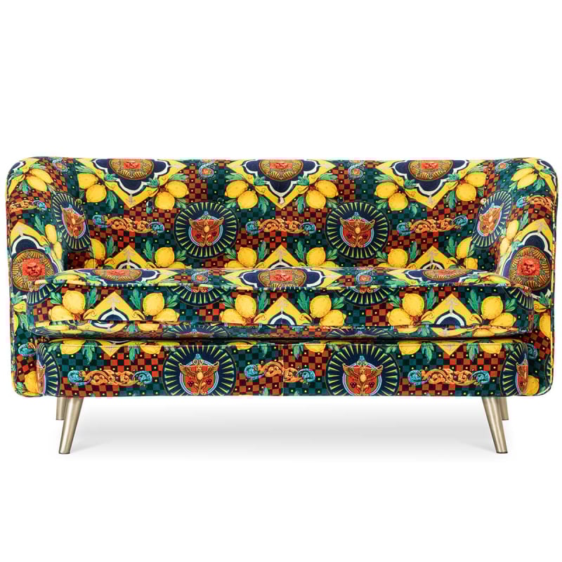 Un motif narratif recouvre le sofa en velours de coton Venice Amalfi, édité par Mindthegap. Un lion majestueux apparaît au centre d’un médaillon brodé, entouré de citrons stylisés et de figures folkloriques. Le coussin d’assise bordé et le dossier capitonné renforcent le confort enveloppant. Le cadre en bois et les pieds en métal à finition laiton soulignent la structure avec légèreté.