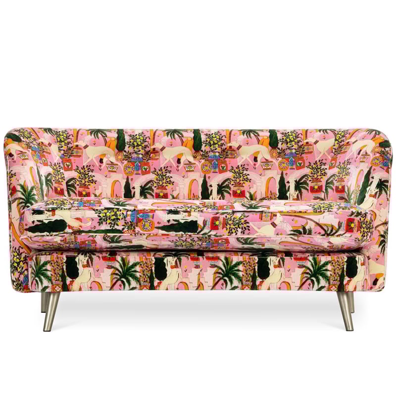 Le sofa Venice Dolce Vita se pare d’un velours de coton au toucher soyeux, reflet raffiné d’un palais italien. Son motif narratif, inspiré des paysages méditerranéens, forme un décor poétique. Les figures féminines s’entrelacent à des éléments d’architecture et de végétation dans une composition dense. Le dossier capitonné, posé sur des pieds en métal, renforce le design enveloppant signé Mindthegap.