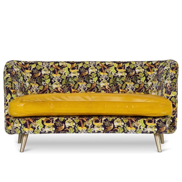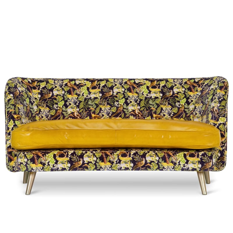 Le sofa Venice La Voliere est un canapé au motif végétal et animalier qui évoque un jardin secret. Dans une scène luxuriante, oiseaux et feuillages s’entrelacent sur un velours de coton au toucher dense. Le coussin d’assise en cuir brillant et le dossier capitonné composent un confort enveloppant. Avec ses pieds en métal, Mindthegap inscrit ce modèle dans une esthétique résolument contemporaine.