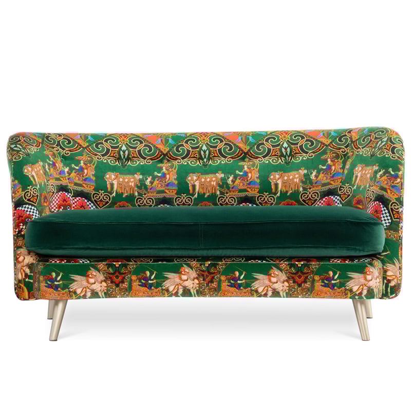 Revêtu d’un velours de coton profond, le sofa Venice Mithology évoque la grandeur de l’Empire romain. Des carrosses tirés par des chevaux, escortés de dignitaires et de figures en marche, composent un motif narratif intense. L’assise et le dossier capitonné dessinent un relief confortable et structuré. Le coussin, généreusement rembourré et recouvert de velours uni, témoigne d’un équilibre maîtrisé de Mindthegap.