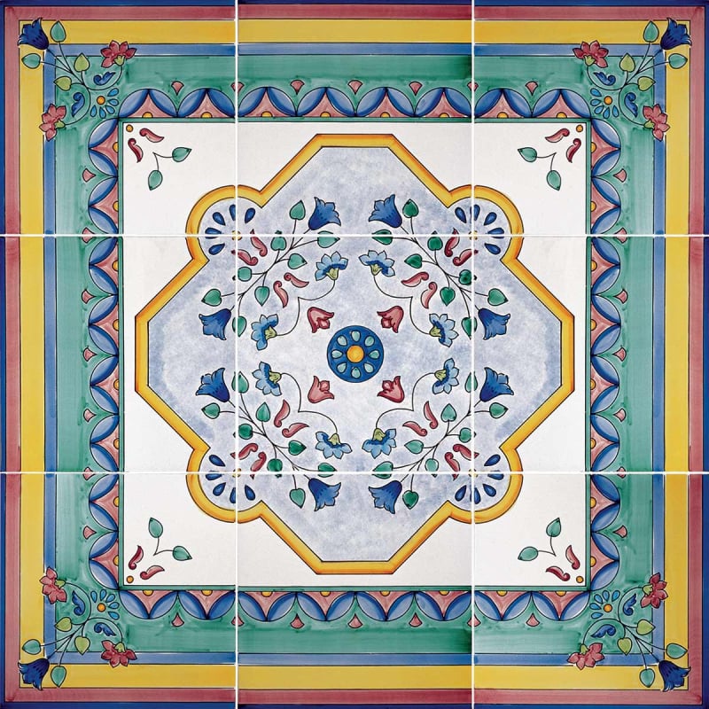 Calcata se compose de neuf carreaux en céramique permettant de constituer un large motif carré. Développé dans des teintes soutenues, cette composition est illustrée de formes florales inspirées des décors anciens de la céramique de Vietri. Cette création au format impressionnant et au charme méditerranéen est entièrement peinte à la main avec la précision et le savoir-faire d'artisans d'exception.