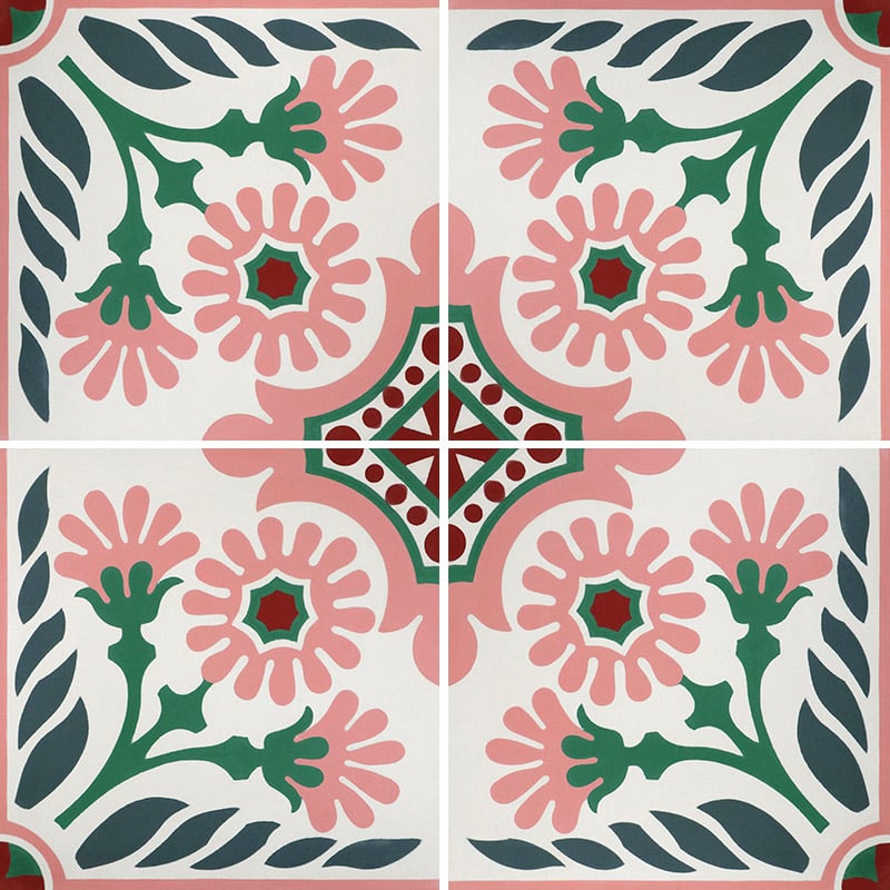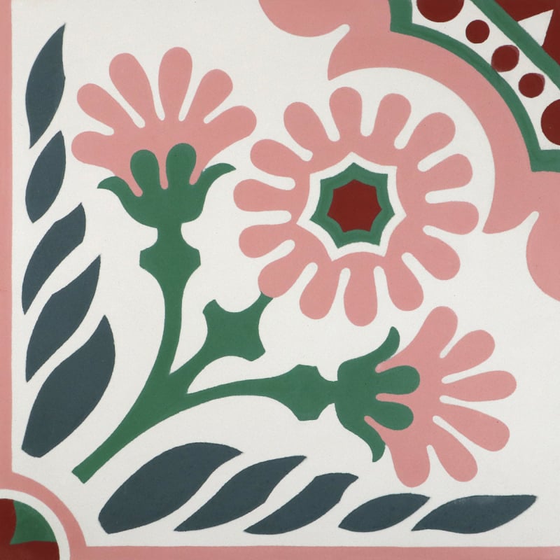 Composé de figures florales et d'éléments ornementaux, les carreaux de ciment Bella présentent un motif à la fois classique et romantique. Les dalles, présentant chacune un bouquet de trois fleurs, s'assemblent pour faire apparaître de larges feuilles stylisées et ainsi créer une composition végétale sur un fond uni qui apporte de la légèreté à l'ensemble.