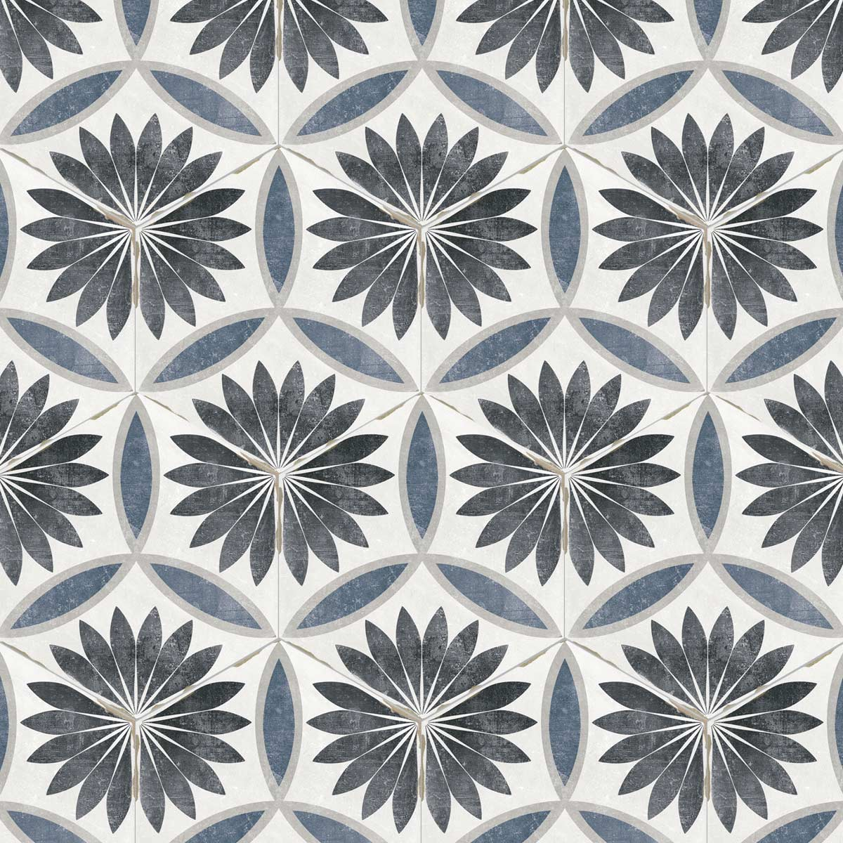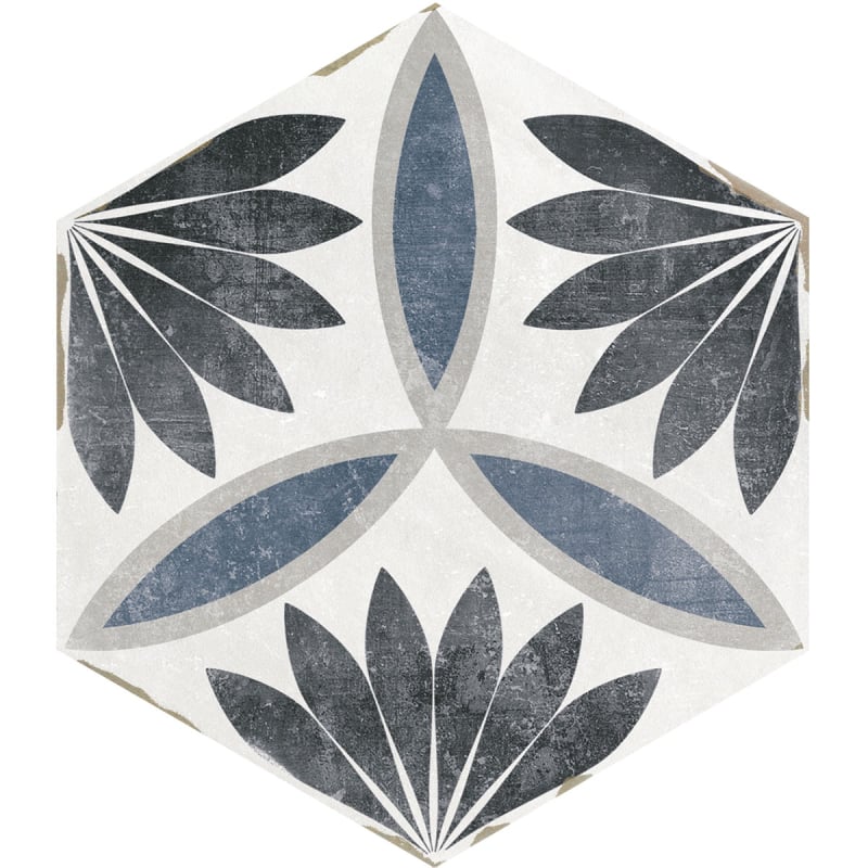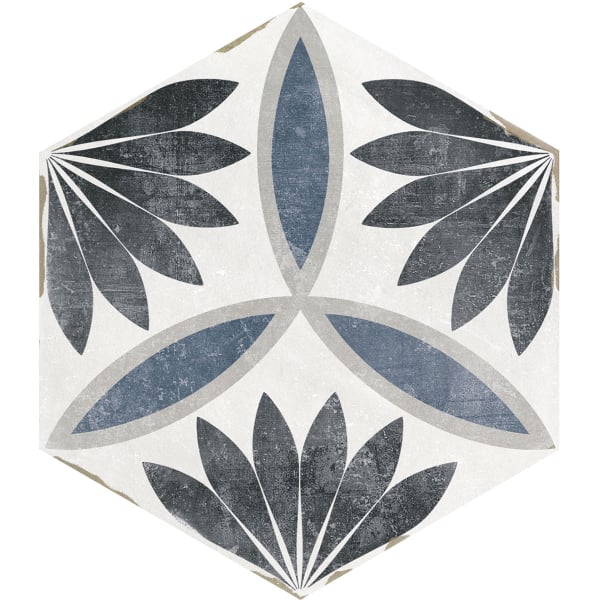 La maison espagnole Nanda Tiles conçoit la tomette Grès cérame Nora comme une dalle traditionnelle hexagonale. La surface texturée et les bords volontairement vieillis donnent l'impression d'un carreau de ciment authentique. Les teintes froides et contrastées mettent en avant un motif floral original.