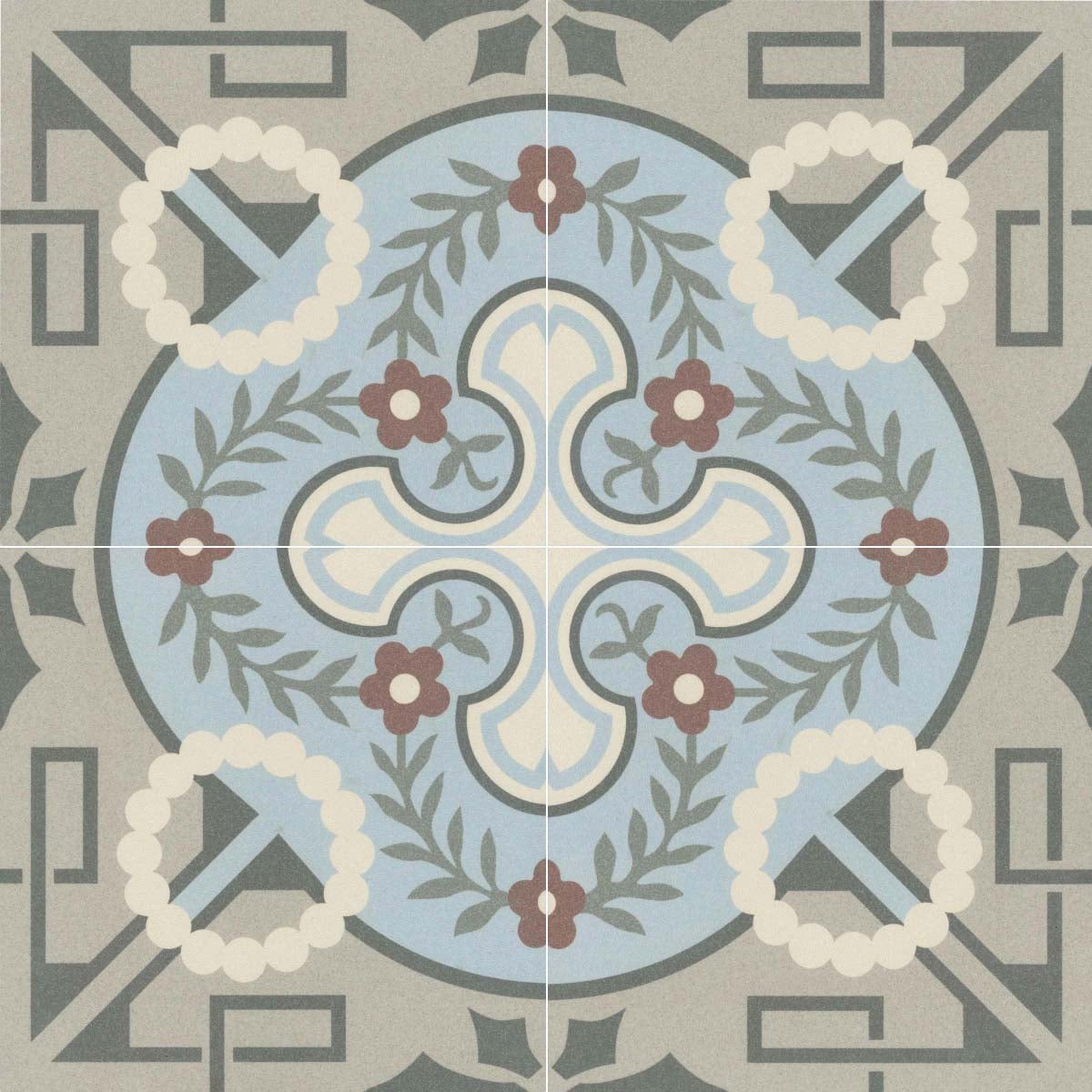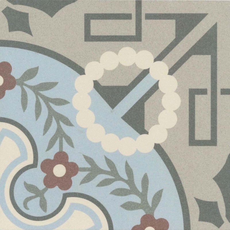 Inspirée par les anciens motifs des carreaux de ciment, la dalle en grès cérame Germaine présente une illustration à l’esprit traditionnel. Dans une palette de teintes harmonieuses, cette composition aux détails champêtres s’accordera avec les projets de décoration en quête d’authenticité et d’histoire.