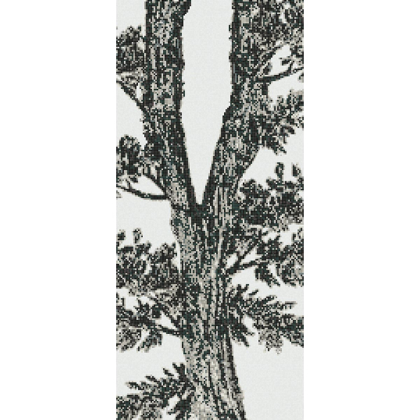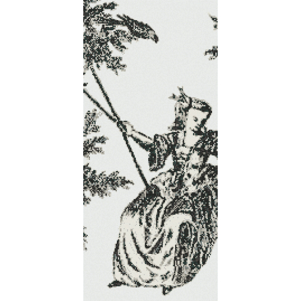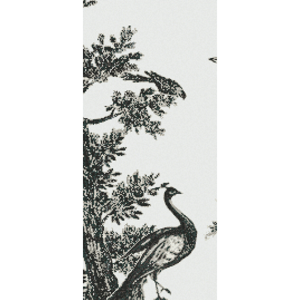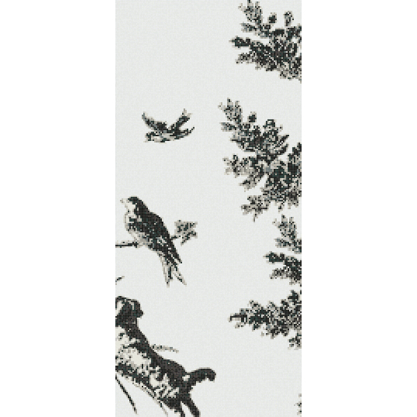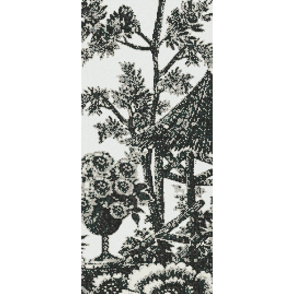 Dans une palette de teintes neutres, la mosaïque Jardin Gris présente une composition paysagère. La faune et la flore cohabitent pendant que deux personnes en habit traditionnel se balancent entre deux arbres. Cette scène pleine de vie et de détails est entièrement réalisée à partir de tesselles carrées en verre. Cette œuvre remarquable offre un décor inimitable.