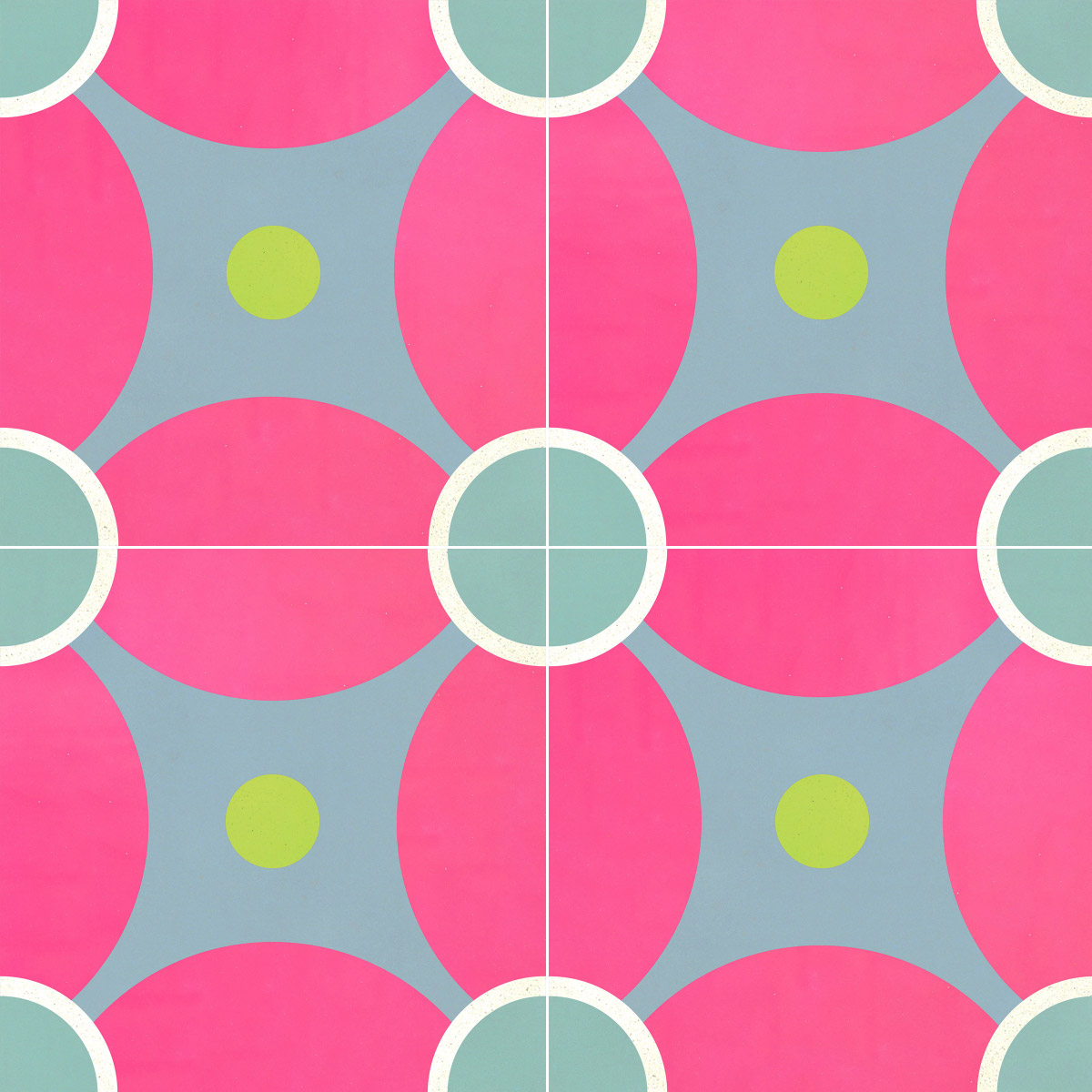 Né d’un partenariat entre Petit Pan et Carocim, le carreau de ciment Galaxie présente un motif géométrique dans des coloris acidulés néons. L’association des différentes dalles crée un ensemble rond et graphique.Il est confectionné grâce à un processus de production artisanal.