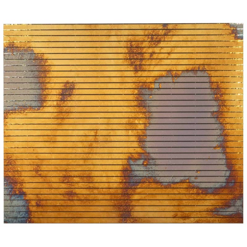 Inspirée des reflets colorés d'un arc-en-ciel, la mosaïque Arcobaleno arbore des rayons dorés illuminant un ciel grisâtre. La dorure, très décorative, est peinte à la main par un procédé d'argenture particulier sur des tesselles rectangulaires en verre réfléchissant. Elle se transforme en tache sombre quand la surface reflète une image, évoquant ainsi les signes d’usure des miroirs d’antan.