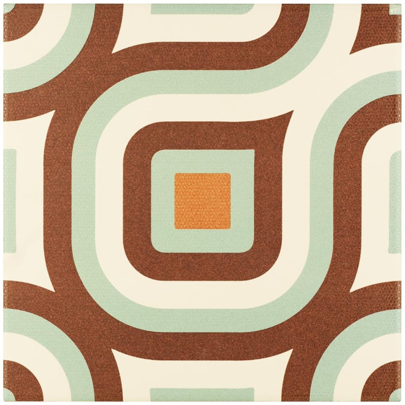 Grès cérame Groovy Dec.N9 est un carreau au motif géométrique rétro, composé de formes concentriques. Des lignes courbes s'entrelacent autour de carrés et esquissent une structure en boucle continue. La répétition rythmée et hypnotique du dessin crée une illusion de mouvement. Le tracé, précis et agencé, reflète la maîtrise graphique de Cevica.