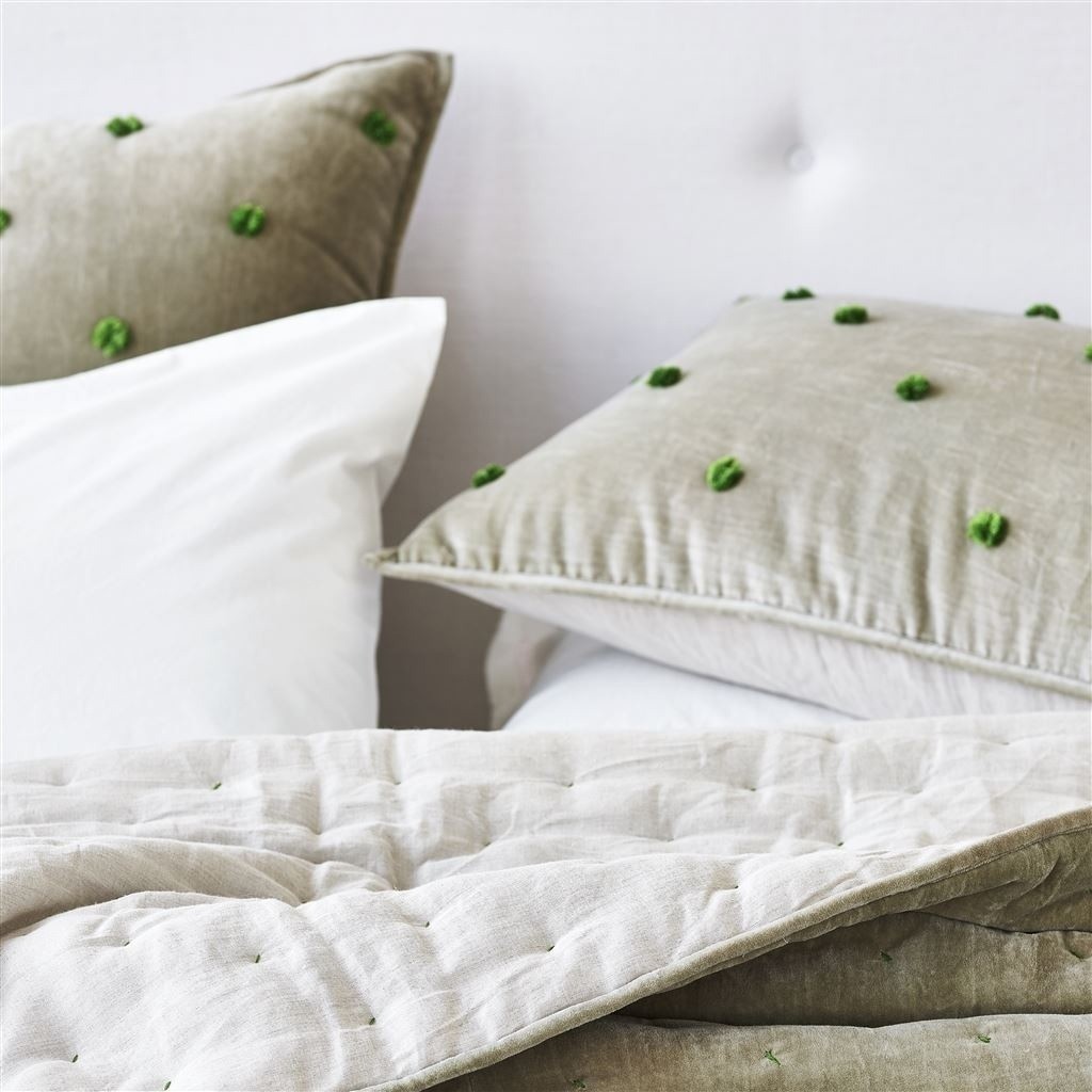Designers Guild propose le coussin carré Sevanti avec une face en velours de coton matelassée. Ce modèle au toucher doux est orné de petits pompons colorés confectionnés à la main. Le dos uni en mélange de lin de cette luxueuse création complète l'ensemble d'une note sobre.