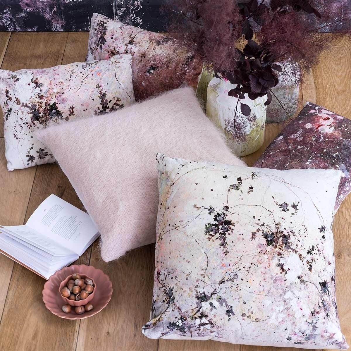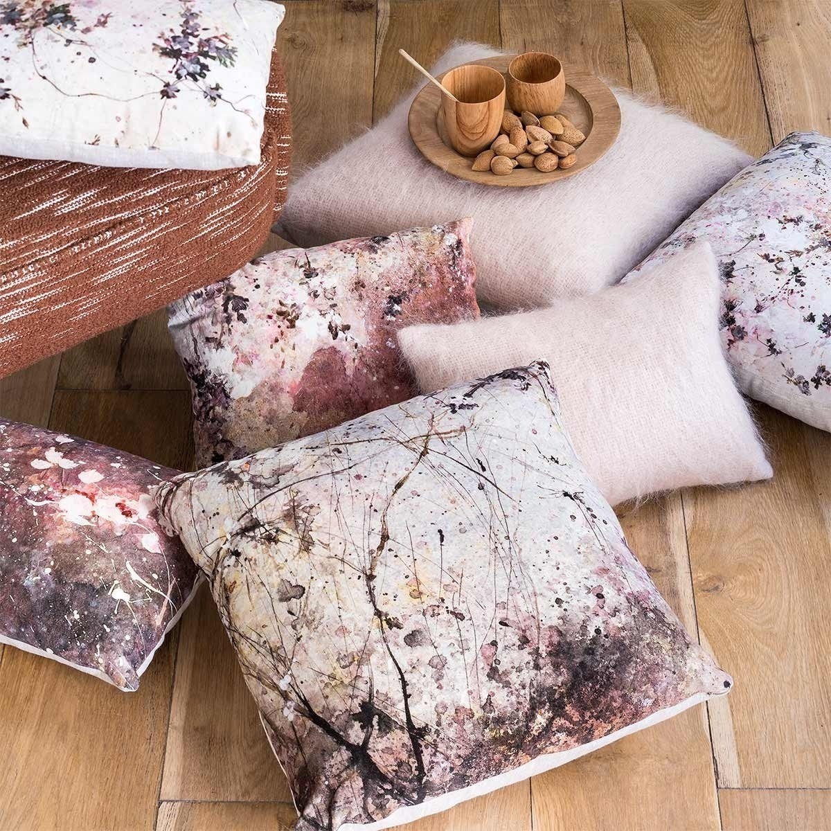 Originellement peint à la main, le motif végétal du coussin Garance représente avec délicatesse des fleurs claires et lumineuses sur un fond nuancé plus sombre. Des touches diluées et des gouttes de peinture apportent un côté abstrait et une impression de texture à l’ensemble. Fabriquée en velours à l’avant et en lin au dos, cette création de petit format signée Illustre ajoute une note graphique et poétique aux décors.