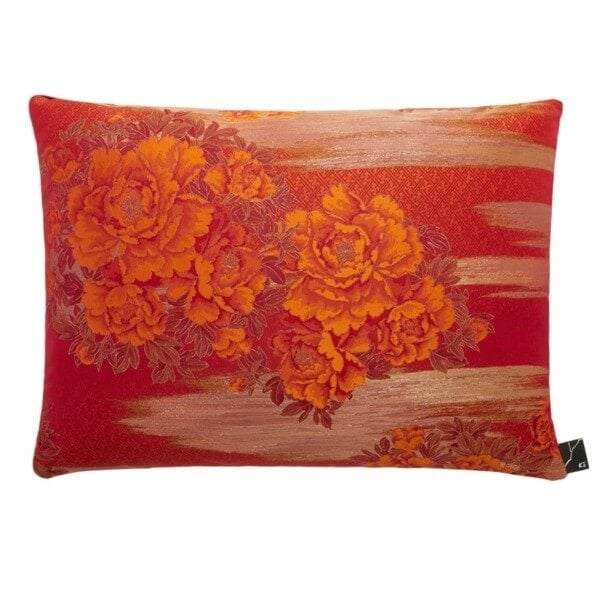 De larges roses aux pétales luxuriantes forment le motif de recto du coussin Maiko Butterfly. Présentée sur un fond de nuages estompés et légèrement dégradés, cette composition florale se décline dans une palette de couleurs chaudes et vives. Ce choix de teintes confère une touche orientale et romantique aux espaces de vie.