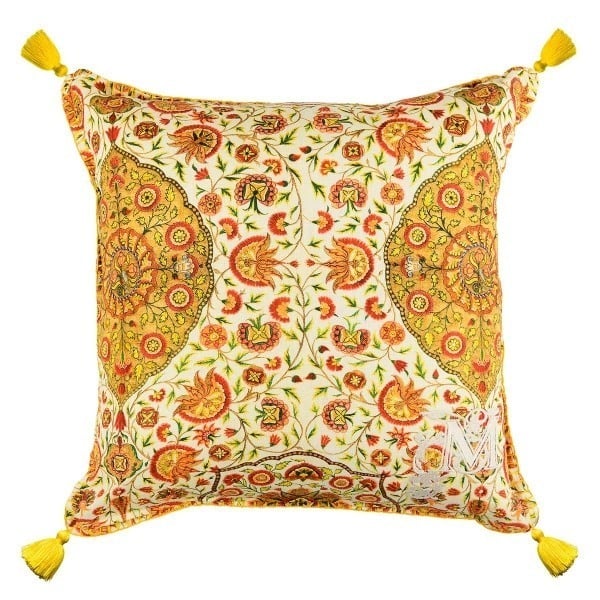 Dans des nuances chaudes, des rosaces et des fleurs imaginaires accompagnées de dessins ornementaux forment le coussin imprimé Csardas. Proposé par Mindthegap, cet accessoire en lin nommé d’après une danse folklorique hongroise installe une touche ethnique aux intérieurs.