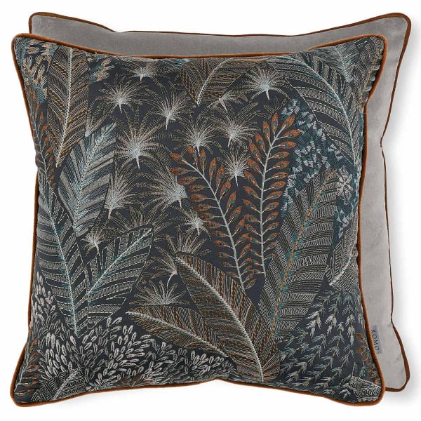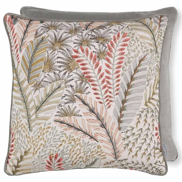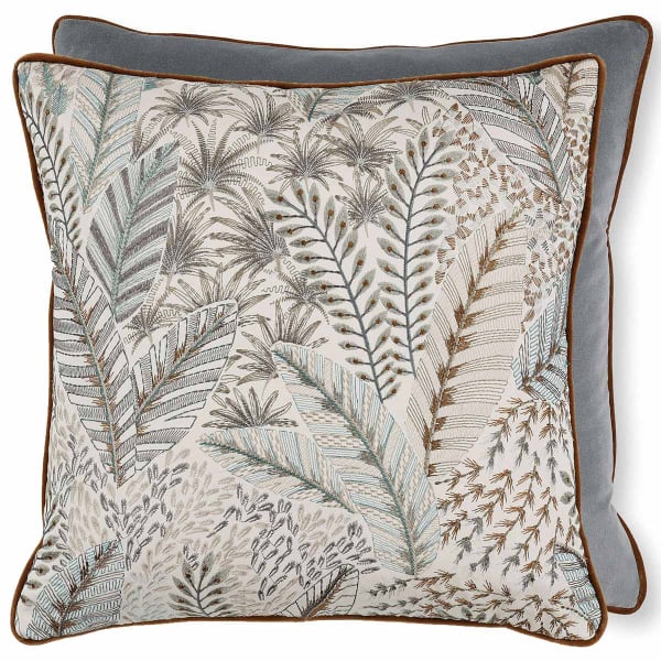 Le design du coussin de Chiraco emprunte l’apparence d’une serre tropicale, et décore les intérieurs d’une touche exotique. Ce motif riche en détail se compose de plumes délicatement brodées sur un satin de coton, agrémenté de feuilles de palmiers. Ce modèle est doté de bords en passepoil, et est proposé par la maison Romo dans des coloris neutres, allant de sombre à clair.