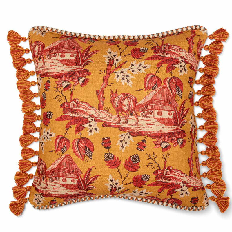 Élaboré dans des couleurs vives, le coussin Namlos de Mindthegap égaye les espaces de vie avec son design. Son motif illustre la vie dans les montagnes tyroliennes en présentant des maisons, des plantations exotiques et des animaux. Confectionné dans un tissu en lin, cet accessoire hautement décoratif offre un toucher agréable. Ses bords se terminent en passepoil et ses deux côtés sont ornés de franges pelucheuses.