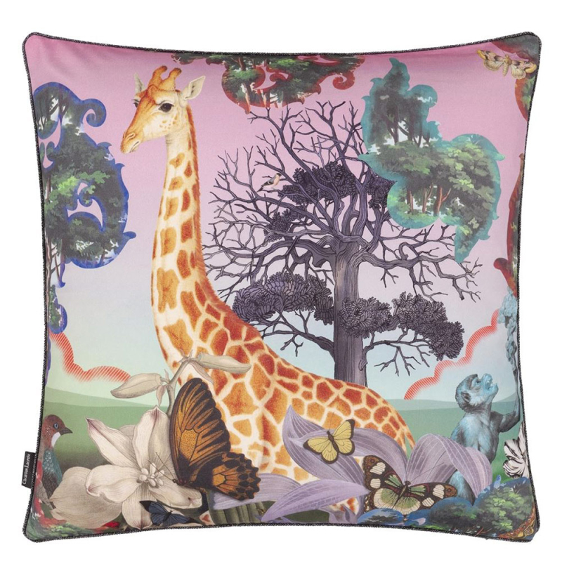 Le coussin Novafrica Sunrise de Christian Lacroix capture l'essence de l'Afrique sauvage dans une explosion de couleurs vives. Son motif fantastique représente un safari africain, avec une girafe majestueuse au premier plan et un lever de soleil spectaculaire en arrière-plan. L'ambiance onirique de l'œuvre est accentuée par un revers marbré polychrome et une finition passepoil en lurex. Ce modèle carré est conçu avec du satin de coton, offrant un toucher doux.