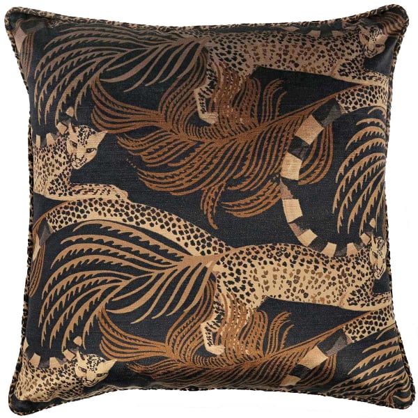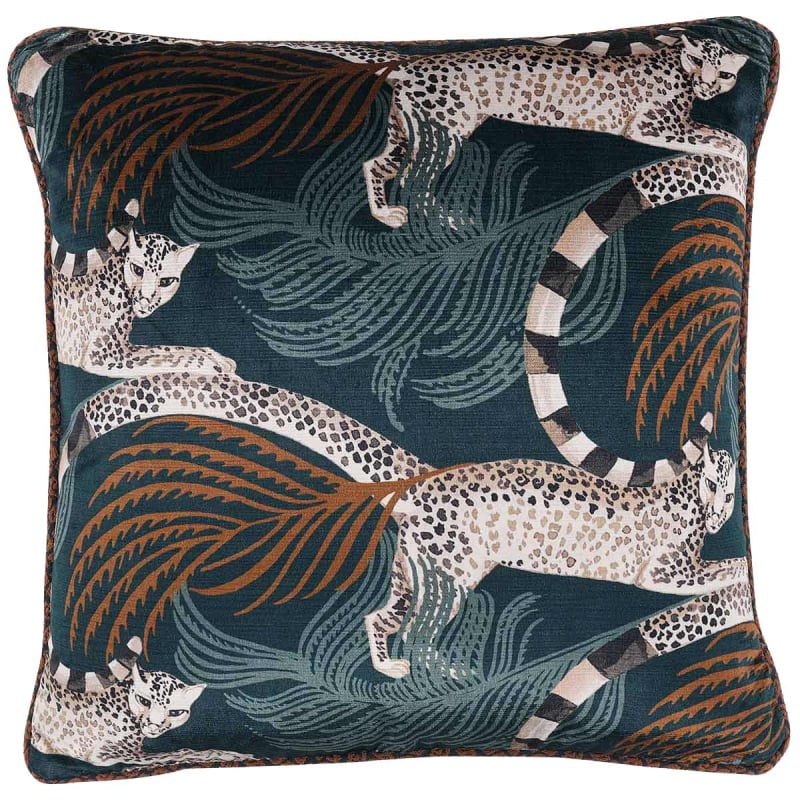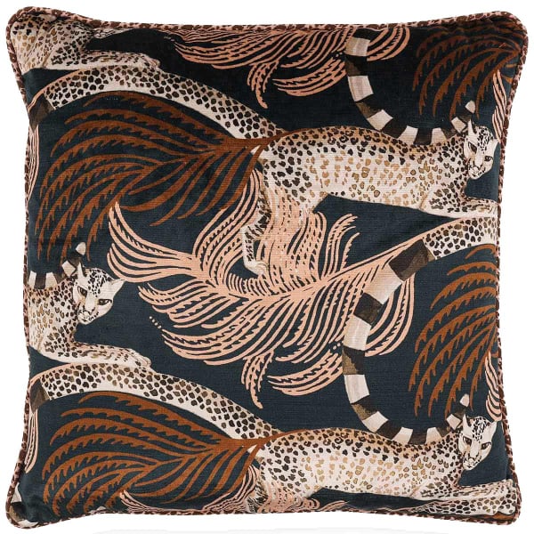 Le coussin en velours de coton Delilah Velvet, édité par Romo, reprend un ancien motif créé par Alice Temperley. Il présente une horde bondissante de léopards aux queues annelées, soulevant une envolée de plumes sous leurs pattes. Leurs regards, tournés vers l’extérieur, rendent la scène immersive. L’ensemble est encadré d’un passepoil imprimé de rosettes, optimisant le côté félin du modèle.
