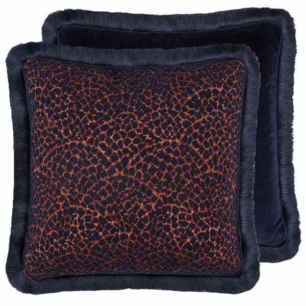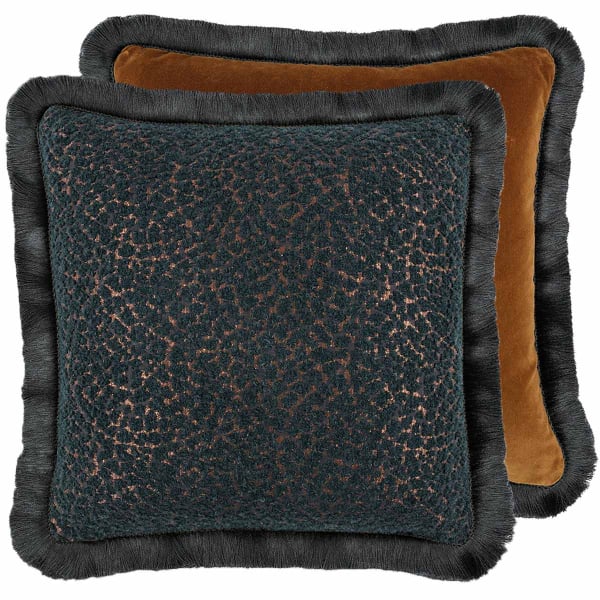 Le coussin Lulu de Romo séduit par son motif léopard en relief signé Alice Temperley. Les taches sombres, en bouclette de laine, contrastent avec les nuances métalliques du fond. Le dos se démarque également par le reflet lustré de son textile en velours de coton uni. Les deux faces scintillent, tout comme le soyeux galon de franges cousu en bordure.