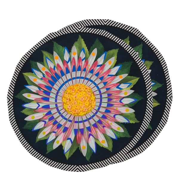 Fleur Fardée est un coussin rond au charme psychédélique créé par Christian Lacroix. Ses deux faces, en coton mercerisé, sont ornées d’une grande fleur d’astéracée riche en couleurs. Elle séduit par son cœur bombé de fleurons, entourés de ligules et de bractées semblables à des plumes panachées. Les figures, rehaussées d’une bordure rayée, éveillent les espaces avec leur graphisme quasi kaléidoscopique.