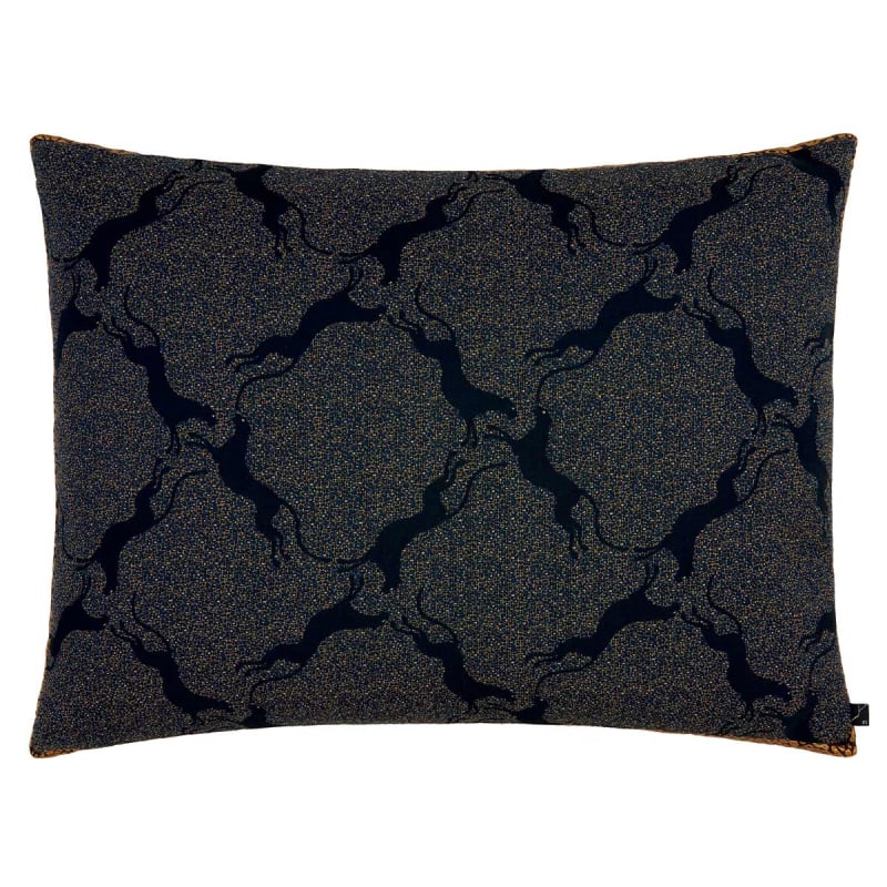 Le coussin Hyou, signé Kenzo Takada, associe le volume et la texture avec un design unique. Sa forme de pavé et ses figures multicolores en relief se démarquent. La face avant présente des silhouettes de pumas bondissants, dessinant des losanges en mouvement. Une bande mouchetée de rosettes dorées souligne la hauteur du coussin, tandis que le dos arbore des vagues formées par le lettrage K3.