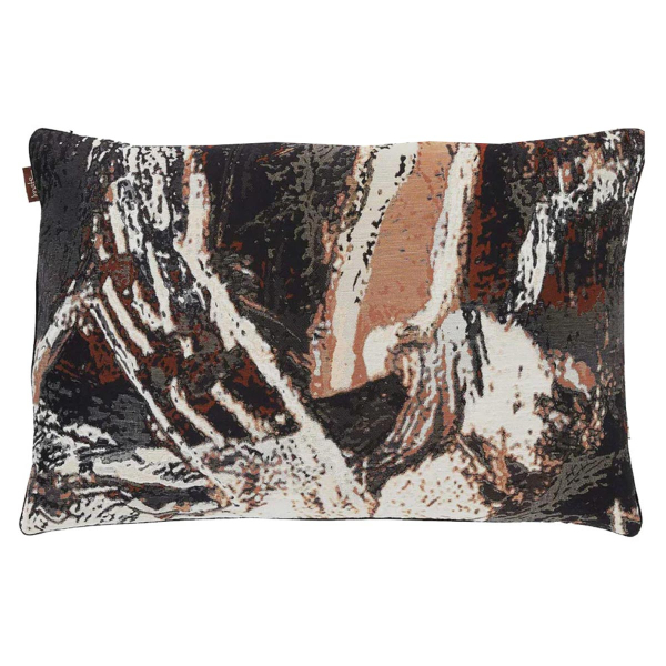 Katherine rectangle est un coussin au motif abstrait imaginé par Innate. Le recto révèle une composition intense, marquée par des mouvements entrelacés, semblables à des veines rocheuses ou des coulées figées. Le verso offre une interprétation plus douce et fluide du dessin, comme un écho atténué de la face principale. Le tissage fait naître des contrastes de textures et de directions. Le modèle est rehaussé par un passepoil ultrafin, apportant une touche discrète qui souligne le format rectangulaire.