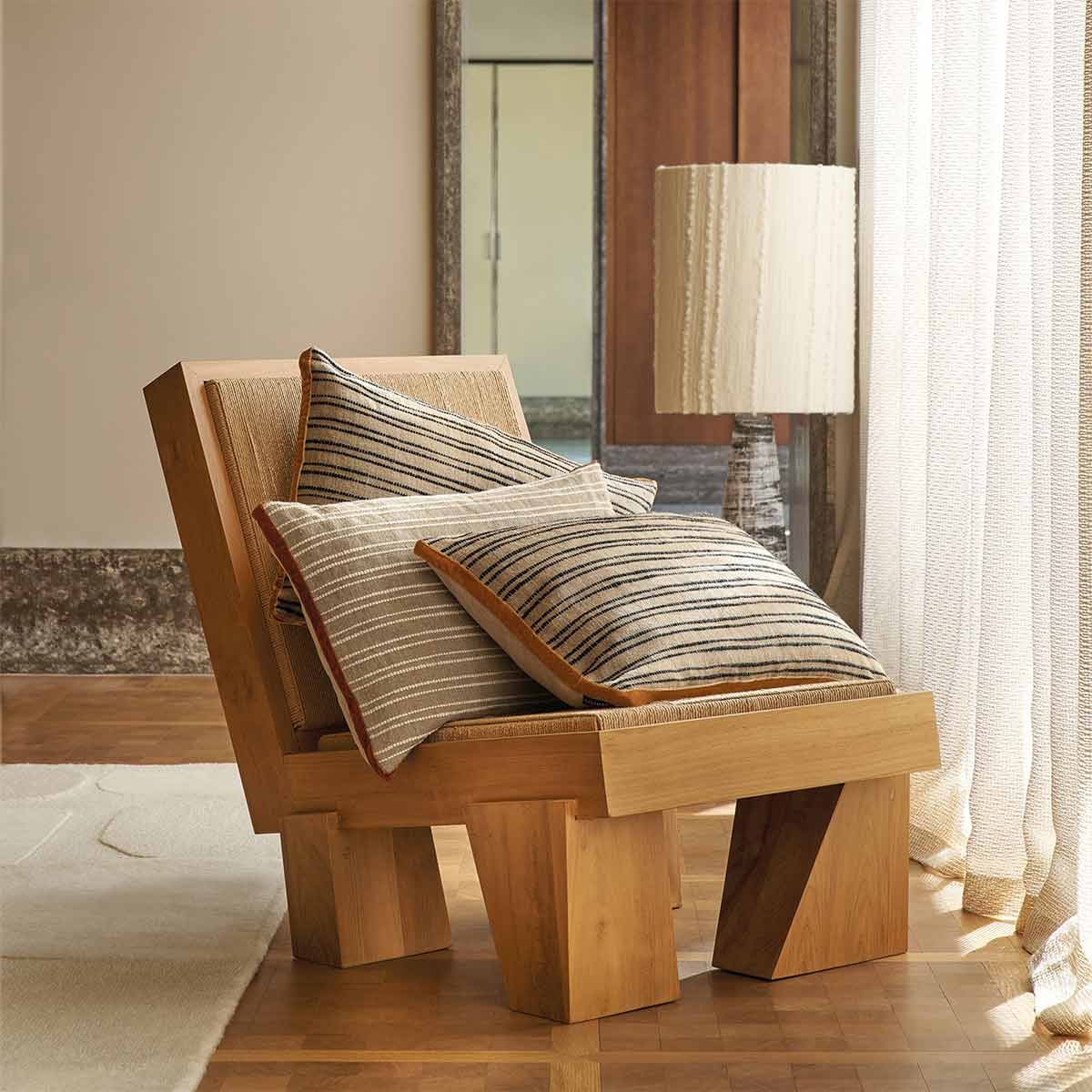 Odea est un coussin rectangulaire au motif rayé, dessiné en pointillés réguliers, qui évoque le rythme délicat d’un tissage artisanal. Sur sa face, les lignes s’enchaînent dans une répétition fluide et mesurée. Le dos uni met en valeur la pureté du lin, matière naturelle sobre et vivante. Casamance souligne le contour avec un passepoil en velours, qui intensifie la justesse graphique de l’ensemble.
