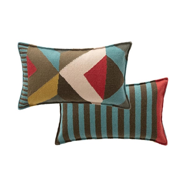 Vanguardias est un coussin à motif géométrique pensé par Gan Rugs. Chaque face révèle une identité graphique : l’une aux formes imbriquées, l’autre structurée par des bandes verticales. Conçu en laine, il prolonge l’esthétique du kilim traditionnel où la trame est tendue et croisée sans nœuds sur métier manuel. Cette pièce fait dialoguer rigueur artisanale et langage contemporain.