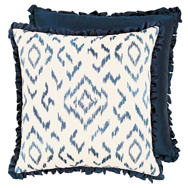 Folly est un coussin à motif géométrique d’inspiration ikat, réalisé en partie en coton naturel. Brodées avec minutie, les lignes irrégulières et discontinues forment des tracés vifs et nets sur le recto. Le revers présente une surface unie, qui tempère l'expression graphique de la face. Un volant dense encadre l’ensemble et affirme la présence visuelle du modèle signé Villa Nova.