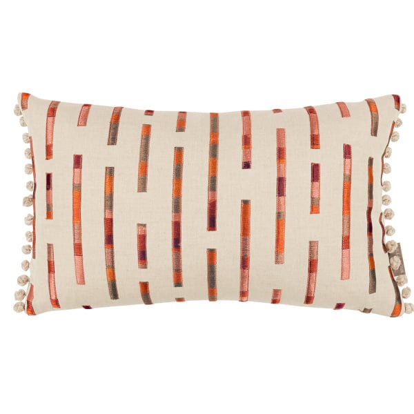 Elwood est un coussin rectangulaire au motif géométrique, composé de lignes verticales brodées de longueurs irrégulières. Ces rayures fragmentées, aux nuances contrastées, instaurent un rythme graphique sur une base partiellement en coton. La finition à pompons discrets sur les côtés accentue le charme visuel. Signé Villa Nova, cette pièce équilibre rigueur structurée et douceur textile.