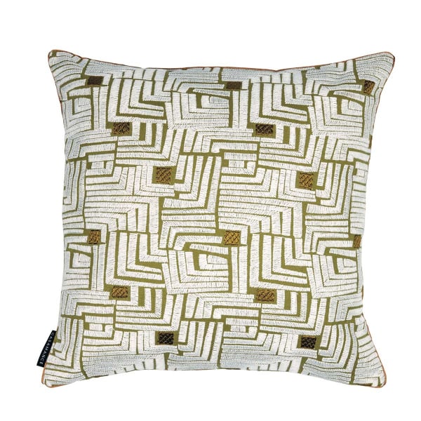 La Maison Casamance dévoile Composition, un coussin dont la face révèle un motif géométrique brodé aux tracés labyrinthiques. Le dessin organise un réseau d’angles et de lignes qui s’entrecroisent avec rigueur et animent la surface textile. Partiellement composé de lin, ce décor exprime une matière naturelle au grain perceptible. Un dos uni et une finition passepoil soulignent nettement sa silhouette.