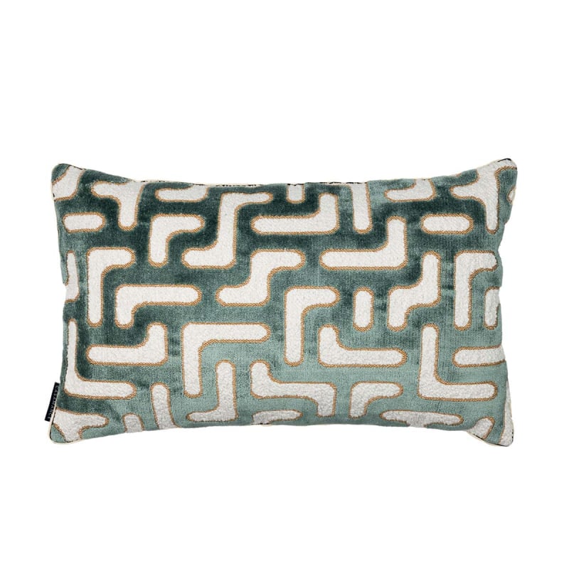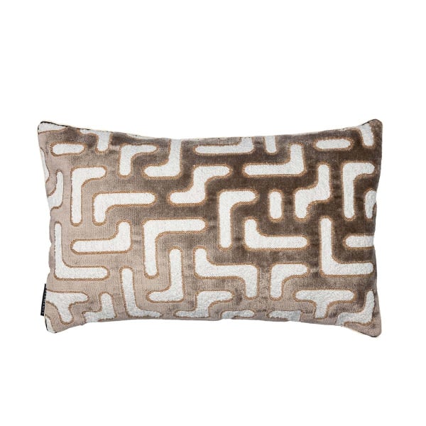 Le coussin Bryce de La Maison Casamance présente un motif géométrique, composé de formes libres entrelacées. Sur le recto, le velours au toucher dense affiche un tracé sinueux, presque labyrinthique. Le verso révèle un lin naturel uni, à la texture mate et vivante, qui introduit une respiration plus sobre. Une finition passepoilée souligne le contour et affirme la silhouette avec netteté.