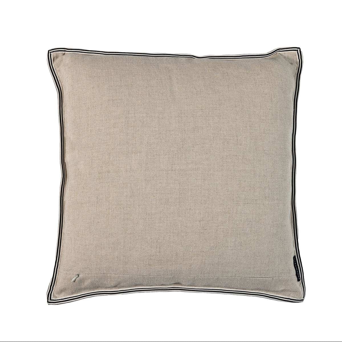 Le coussin Daim de La Maison Casamance dévoile un motif géométrique qui évoque un pelage de félin. Des empreintes irrégulières aux contours nuancés confèrent à la surface une présence singulière. La broderie se détache sur une matière à la texture veloutée, au toucher souple et dense. Au revers, un lin naturel uni dialogue avec une bordure galon qui encadre l’ensemble avec précision.
