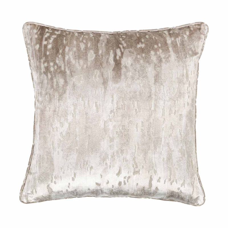 Édité par Zinc, le Coussin Raval capte le regard par la tension graphique de son motif. Des lignes anguleuses, presque minérales, tracent une abstraction qui évoque le veinage fragmenté du travertin. Le velours, d’une douceur dense, se découpe avec relief sur un fond jacquard discrètement lustré. Cette composition déploie un jeu subtil entre textures mates et éclats soyeux.