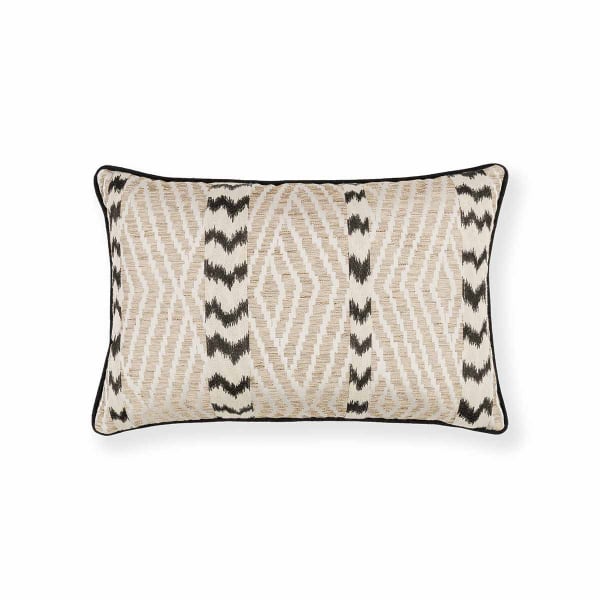 Romo présente le coussin Indu, où le losange s’élance comme une trame vivante, rehaussée d’une rayure brodée au rythme volontaire. Inspiré de l’ikat, son motif géométrique se construit par contrastes subtils et reliefs croisés. Le fil court et le point texturé s’alternent pour faire vibrer la surface. Une bordure passepoilée encadre l’ensemble d’un trait net.