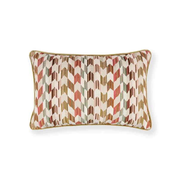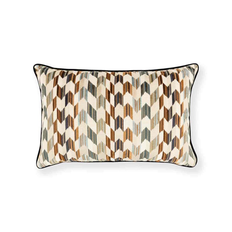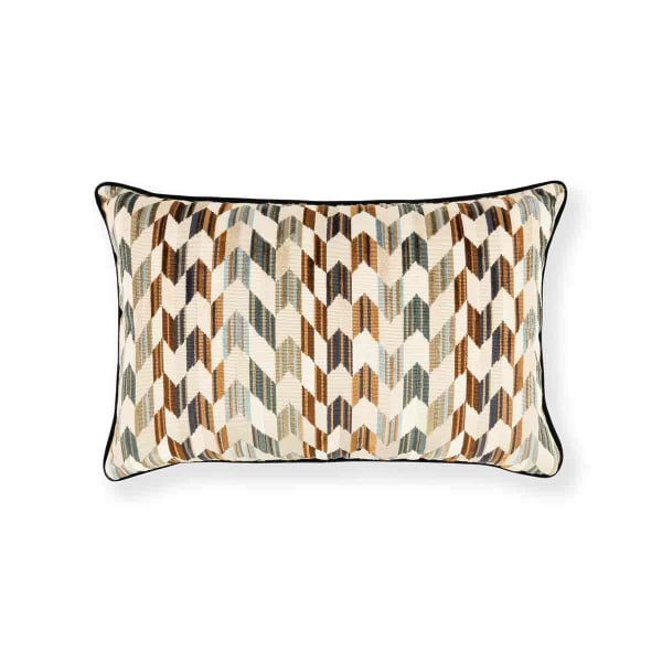 Romo révèle avec le coussin Tabora un jeu graphique à la fois rythmé et tactile. Le motif, composé de fléchettes enchevêtrées, s’anime dans un velours bouclé à la texture duveteuse. Chaque relief accentue la sensation de mouvement et invite le regard à suivre ses lignes. Une bordure passepoilée souligne l’ensemble avec précision.