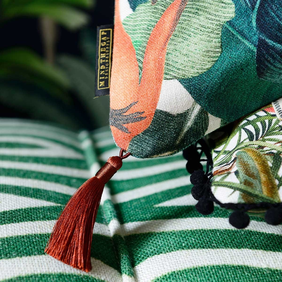 Il cuscino Parrots of Brazil presenta pappagalli dai colori vivaci appollaiati su una pianta tropicale. Stampati su uno sfondo decorato con palme e fiori vari, questi uccelli si posano con grazia per rivelare i loro magnifici ornamenti. Mindthegap propone così un accessorio decorato con pompon di lino dallo stile esotico.