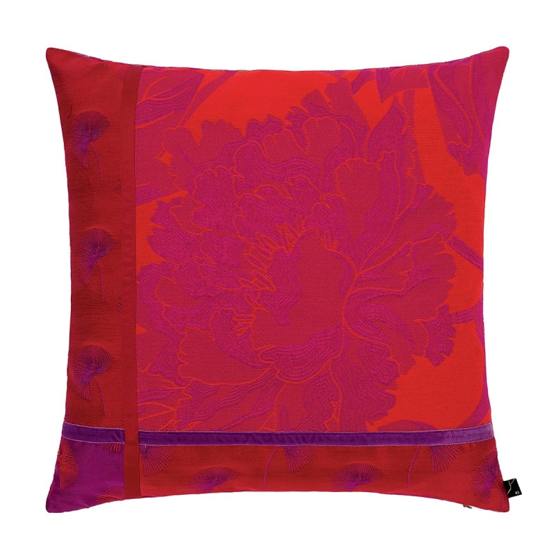 Pivoine by K3 Design portrays the enchanting beauty of the peony, considered the Queen of Flowers in Japan. Designed by Kenzo Takada, this cushion is a patchwork of velvet, jacquard fabrics, and grosgrain ribbons. The richness of its color palette and texture captivates the eye, inviting fingers to explore its details.