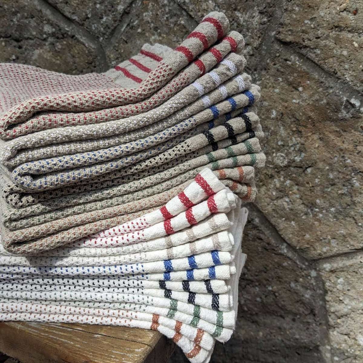 Das Geschirrtuch Maya zeigt ein Streifenmuster, das eine strukturierte Oberfläche aus regelmäßig gewebten Fäden umrahmt. Dieses grafische, diskrete und strukturierte Spiel spiegelt das Know-how von Charvet Éditions wider. Dieses aus Leinen und Baumwolle gewebte Tuch weist eine weiche und dichte Zusammensetzung mit einem Hauch von Authentizität auf. Jede Faser erzählt hier eine Geschichte von Präzision und visueller Harmonie.