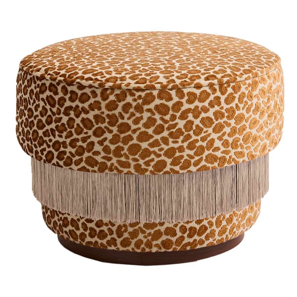 Der Hocker Le Piaf Léopard ist mit Jacquard-Samt mit Tierflecken bezogen, die mit handwerklichem Können auf einem Webstuhl gezeichnet wurden. Das Leopardenmuster offenbart ein Spiel von Texturen zwischen rasierten Teilen und satinierten Reliefs für ein leuchtendes Aussehen. Die Struktur aus Massivholz und dichtem Schaumstoff sorgt für einen einladenden Sitz. Das runde Volumen, das durch zarte Fransen unterstrichen wird, verkörpert den Retro-Geist von Clovi.
