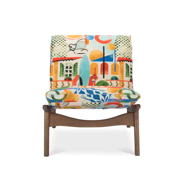 Der Stuhl Alyson Veranda Linen ruht auf einer polierten Holzstruktur mit einer klaren und minimalistischen Silhouette. Die großzügig gepolsterte Sitzfläche und die geneigte Rückenlehne zeichnen eine komfortable Linie, die den Körper sanft aufnimmt. Der Leinenstoff weist ein figuratives Muster mit naiven und spontanen Zügen auf. Er ist von Mindthegap signiert und stellt eine subtile Balance zwischen Form und Erzählung dar.