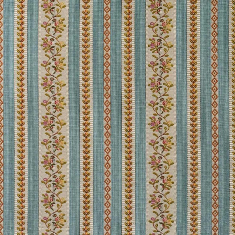 Der von Antoine d'Albiousse entworfene Stoff Manon präsentiert vertikale Streifen, die mit Rauten und floralen Dekorationen verziert sind. Diese Seide im Stil Louis XVI wird in hellen Tönen angeboten und bringt die Innenräume zum Strahlen.