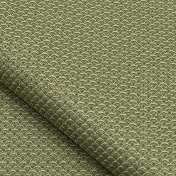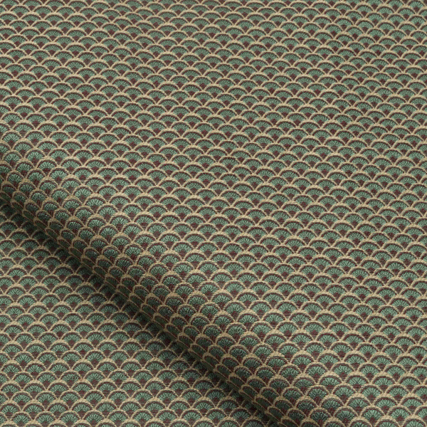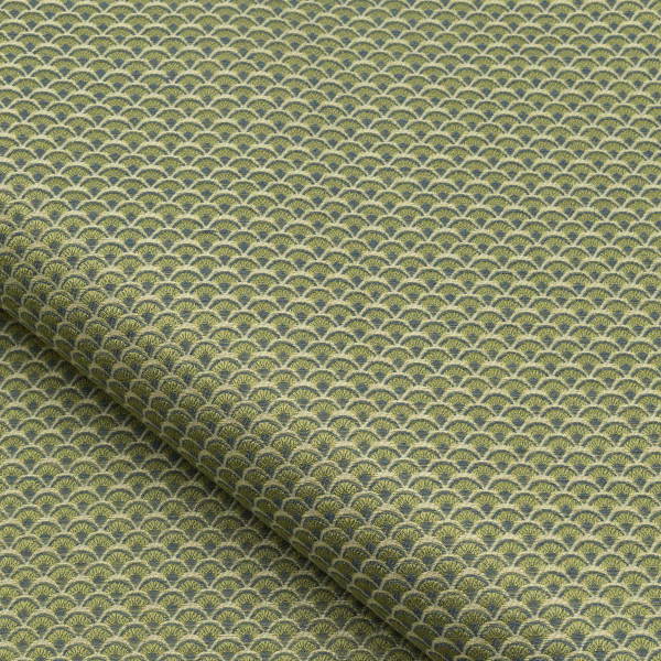 Dieser Stoff mit Art-Déco-Einflüssen präsentiert ein Muster aus kleinen Fächern, die wie Schuppen zusammengesetzt sind, und eignet sich für alle Polsterarbeiten. Er ist widerstandsfähig und hell und in einer Palette von satten und intensiven Farben erhältlich.