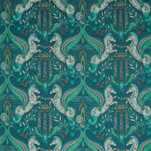 Clarke & Clarke präsentiert Odyssey Mythos, ein Stoff, der in die griechische Mythologie entführt. Fische mit Pferdeschwänzen stehen sich in einer symmetrischen Komposition gegenüber, umgeben von eleganten Blättern und fantastischen Kreaturen. Jedes fein gearbeitete Design unterstreicht die Tiefe und Raffinesse des traumhaften Musters.
